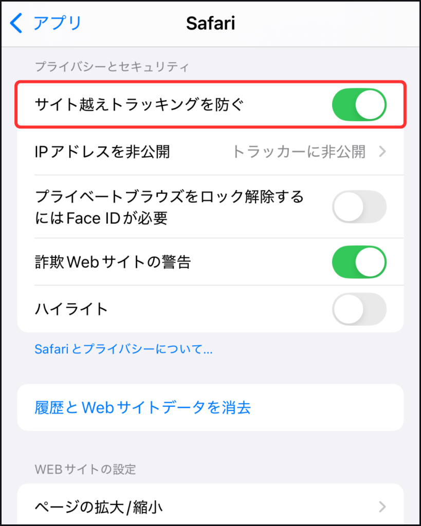 設定→Safari→サイト越えトラッキングを防ぐを解除