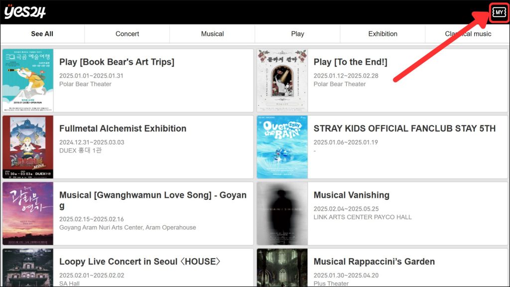 ↑がYES24 TICKETのサイトになります。