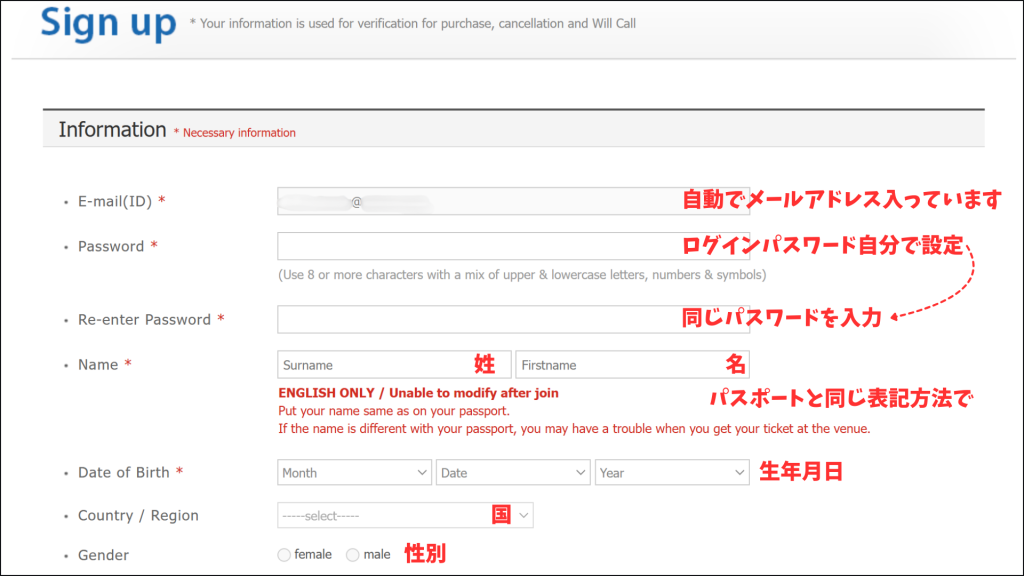 あとは生年月日と国と性別を間違えないように入力しましょう。