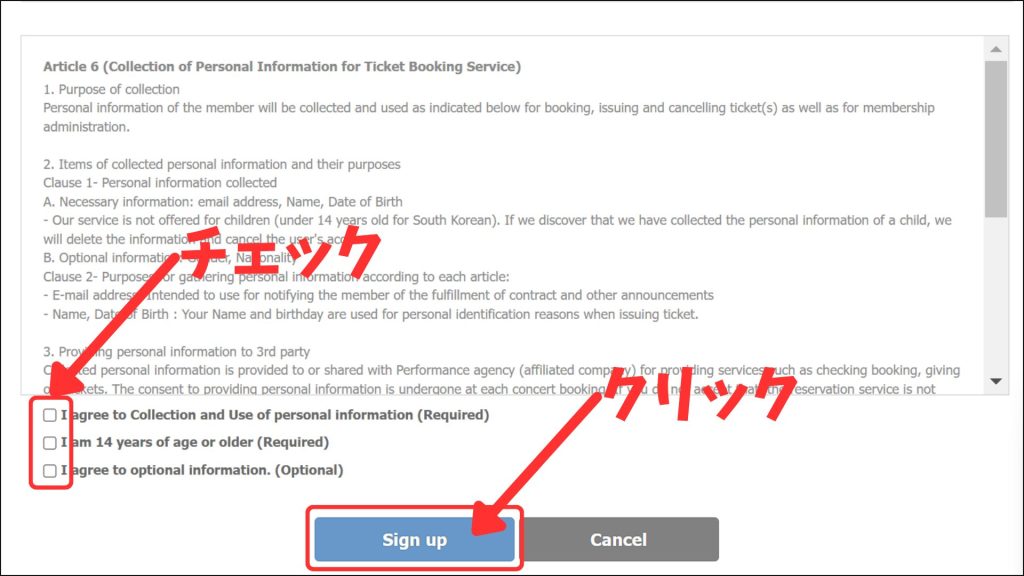 最後にチェックボックスにチェックを入れて[Sign up]のボタンを押せば登録完了です!